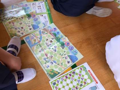 「自分の町を作ろう」というワークシートで、自分が作りたい町に設置したい施設をシールで貼っていきます。貼り終わったあとで、「図書館」「区役所」「学校」「公園」「公立動物園」「消防署」「公立病院」などは、すべて税金から作られていることを知り、住みよい街するために「税金」が大切なことを学びました。