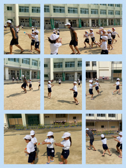 水着の上に体操服を着て、運動場で水を飛ばしたり、かけ合ったりしました。子ども達は、運動場を走り回りながら、先生を追いかけて笑顔で水をいっぱいかけていました。(笑)
