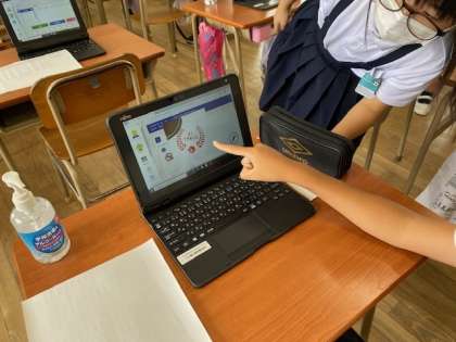 その後、もう一つの目標「デジタルドリルが使えるようになろう」の学習に入りました。1時間目に実施した6年生では、全員が使用すると動作しなくなる、ということとなり、ルーター設置の意味がなくなりかけたのですが、3時間めや4時間目に実施した5年生は、サクサク進みました。昨日の研修会を受けて、すぐに子どもたちへと伝授することができました。