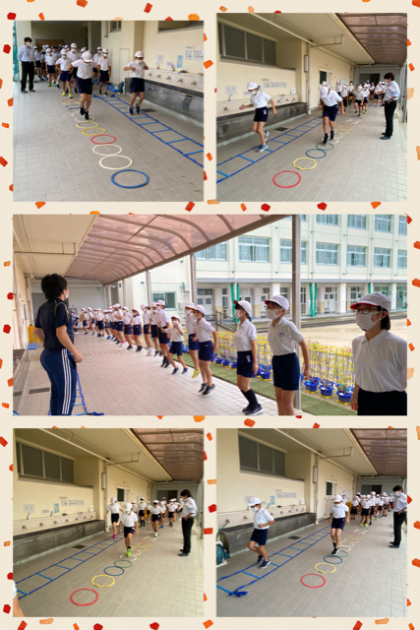 給食室前スペースに集合した「屋外スポーツB」は、地道に「ラダートレーニング」で、運動会に向けて瞬発力を養い、走力をつけようと笠井先生。子ども達は、「雨ビーム出したから…」とか言いつつも、がんばっていました。