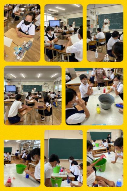 6−1は図工室で美術。学習後に子ども達へ感想を聞きました。「たかが、二つの色やん、と思っていたけれどそこからいろんな色ができるんだ、と感動した。」「きれいだった!(^O^)」とのこと。
