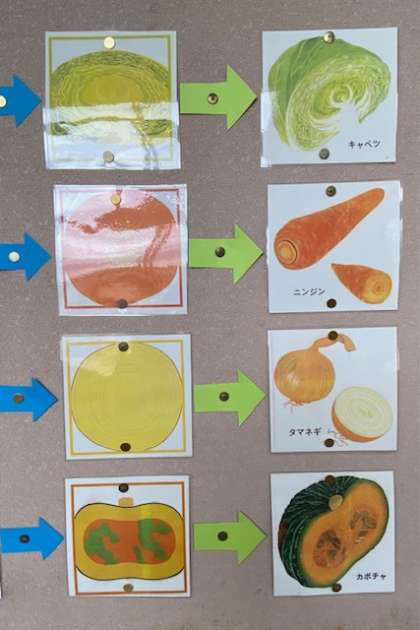 上から、キャベツ・にんじん・玉ねぎ・カボチャ、の断面のシルエットでした。