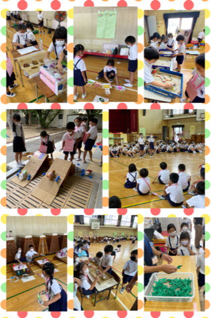1年生を招待して、ゴムや磁石などの働きを利用したおもちゃを使っお店屋さんごっこを楽しんでもらいました。コロナ対策で密を避けるために、クラスごとに招待しました。