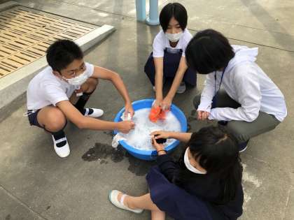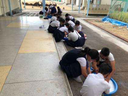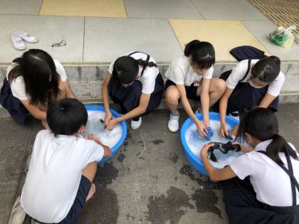 6時間目に、今日一日履いていた靴下を洗濯しました。たらいに水をためて、事前に学習したとおりに、もみ洗いやつまみ洗いをし、それから水をかえてすすぎ洗いをしました。その後、教室前の廊下に干し竿を出し、干しました。明日には乾いていますね。