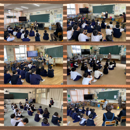 今日は、2年ぶりに東住吉図書館「お話玉手箱」の方々に来ていただいて、2時間目は各学年1組、3時間目は各学年2組が、教室のカーテンは閉めて、ふだんと違う雰囲気の中、物語の世界へいざなってもらいました。