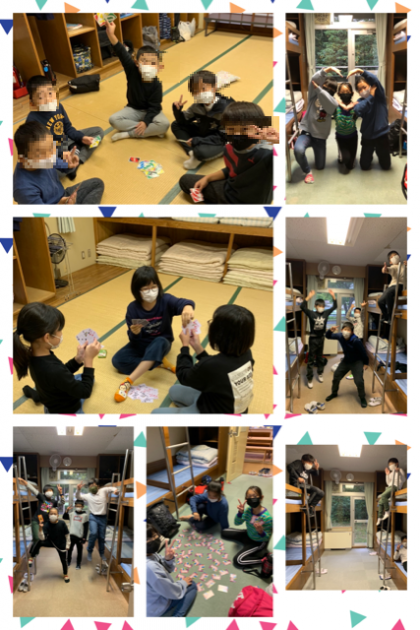 トランプやUNOを楽しんでる部屋や、みんなでワイワイおしゃべりにいそしんでいる部屋、そして二段ベッドでウキウキの部屋などなど。みんな楽しんでます(^O^)