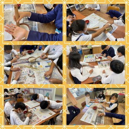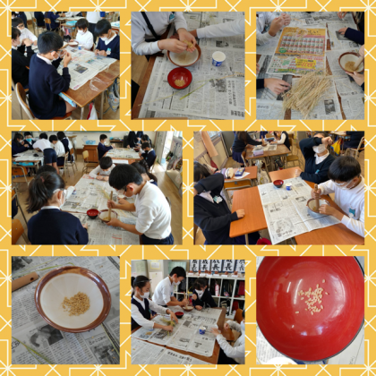 子ども達は、楽しみながらも、一粒一粒を大切に、もみすりをしていました。学年合わせて、玄米がお椀三分の一杯分ほどできました。