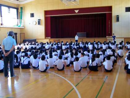 今日の児童集会で、月曜日に編成したなかよし班で集まり、並び方やメンバーの確認をしました。