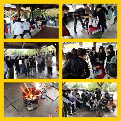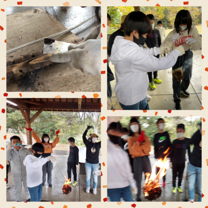 2組(下の写真)は、「ほりお!ほりお!」のコール。しかし、小雨が降り出し、それでも「ほりお!ほりお!」と頑張りましたが、惜しくも火は熾らず。最後は、火種をもらって、暖まりました。