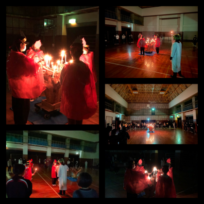 「感謝」「友情」「責任」「努力」の4人の火の精たちに授けられた火が、キャンドルに灯されます。