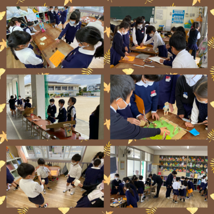 『なかよしオリエンテーリング』で全校児童が拾い集めたドングリやマツボックリで「どんぐりランド」を開き、二年生を招待しました。