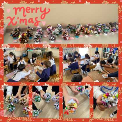 1年生が、まつぼっくりでかわいいミニクリスマスツリーを作っていました。