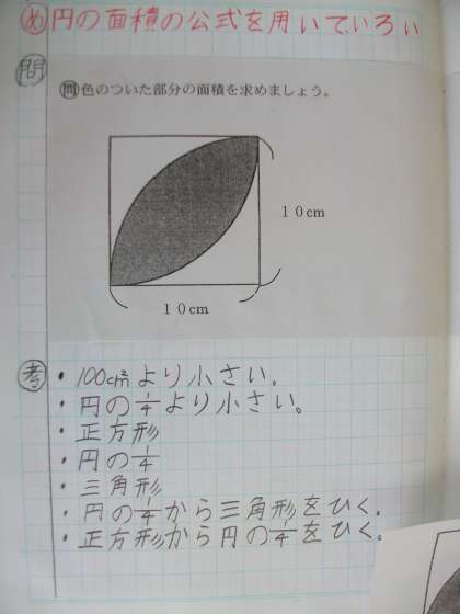 この学習は、とても難しく、円の面積の公式を活用する上に、論理的に考えを進めていかなければならない課題です。