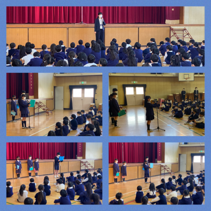 2・3・5・6年の代表児童からも、2学期の思い出の発表がありました。「生活科のおもちゃランドに1年生を招待したこと」「コロナでずっといけなかった社会見学でしたが、やっと商店街に行くことができたこと」「自主学で『ふだんの当たり前のことが実は幸せ、だから大切にしよう』SDGsについて学んだこと」「ピース大阪に社会見学に行き、過去の戦争の恐ろしさを学び平和のありがたさを実感したこと」等、それぞれの学年で学んだことを中心に発表してくれました。