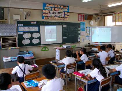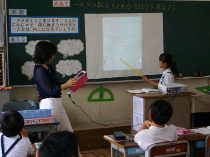 子どもたちは、かけ算九九の復習の後、「あめを同じ数ずつ3人で分けると……」の課題にチャレンジしました。