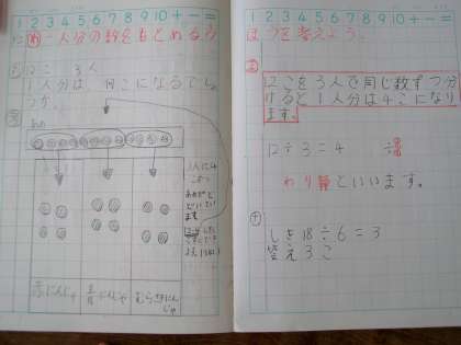 「新しい計算を考えよう」⇒3年生で初めて出てくる計算、『わり算』の意味(同じ数ずつ分ける)の学習でした。