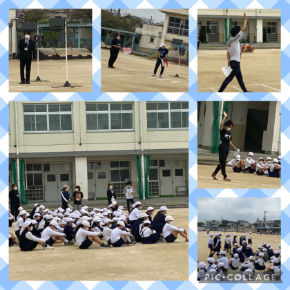 お話の後は、担当の増池先生の指示で、まずは先生たちの見本を見せます。その後、それぞれの班ごとに、実際に運動場に書いた大きな道路を歩きます。横断歩道を渡るときは、右左右と確認して手を挙げてわたりましょう!!!