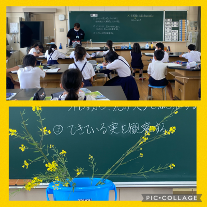 5年2組は理科室で理科の授業をうけていました。専科の谷先生とアブラナの観察を行うそうです。新転任の増池先生の授業もまたいつか、取材したいと思います。(^_^)