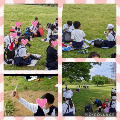 たいがい、遠足へ行くと、他の学校が先に来ていることも多いのですが、今日は鷹合小が一番のり。大繩とび、虫さがし、ドッジビー、おにごっこ、だるまさんがころんだ…まぁ、遊びつくしてのお弁当タイムです。