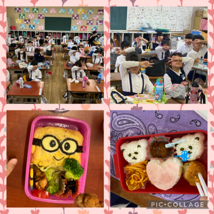 1年生の教室に入ったら、キャラ弁というのでしょうか?「これ、見て!!」と嬉しそうな子どもの顔。こっちまで、笑顔になりますね。