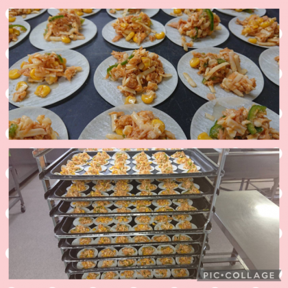 今日の変わりピザは、子どもたち大好き💛人気メニューです。なんと、栄養教諭の松阪先生が、調理中の様子を写真に撮ってくださいました。