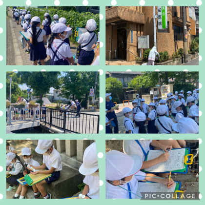お茶をのんで一休み。お茶休憩の前には消毒をして…PTAの方にいただいたアルコールボトル大活躍です!!日陰に入って、たんけんボードに見つけたことをかいていました。休憩の後は、鷹合神社、4丁目のお魚やさんを見て帰校しました。