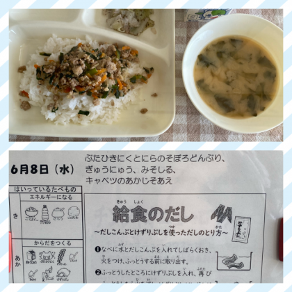給食カレンダーを見ると、今日のみそ汁は、だしこんぶとけずりぶしを使った合わせだしで作ったそうです。ダブルの出汁で、おいしさ倍増といったところかな?と考えてたら、栄養教諭の松阪先生が、