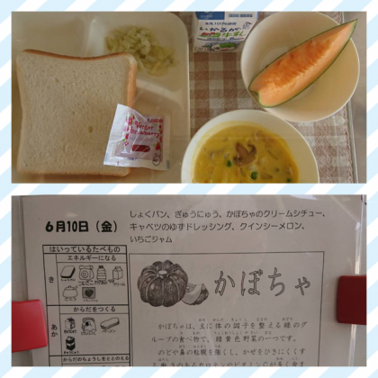 きれいなメロンの色。見た通り、とっても甘くておいしかったです。かぼちゃのシチューもきれいな黄色。