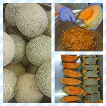 メロンを見てください!ゴロっとした大きなメロンを二つに割って、手作業で種をとってくださっています。これで、小さい子どもたちも食べやすいですね。