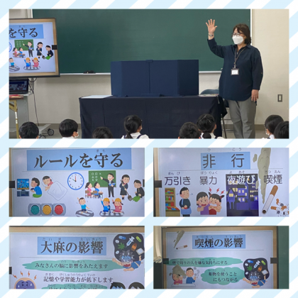 講師は、大阪府少年サポートセンターの方で、5年生の子どもたちに、喫煙や大麻のこわさ、「万引きは非行の入り口」だと教えてくださいました。