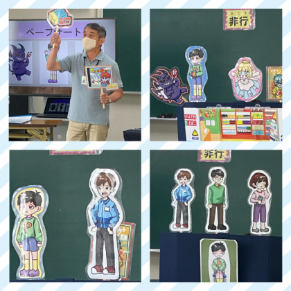 万引きについては、ペープサートを使って、主人公のピースくんがまんがが欲しくて万引きしてしまい、警察の人や店の人に叱られ、家の人を困らせるという話を見せてくださいました。子どもたち、真剣に見入ってます。