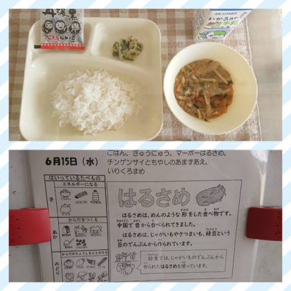 昨日から、近畿地方も梅雨入りだとか。平年より遅いらしく、これからしばらくすっきりしないお天気のようです。そんな天気の今日の給食は、マーボー春雨に甘酢あえ。