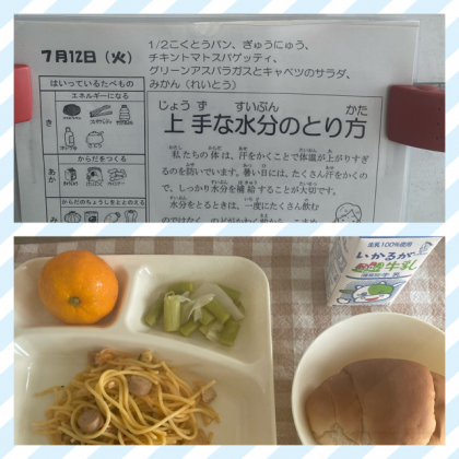 スパゲッティは、こくとうパンにはさんでパクリ。こくとうパンって、ほんのり甘くておいしいんです。そして、お楽しみは冷凍みかん。ちょうど、デザートでいただくときには、カチンカチンのみかんがとけてシャーベット状態の食べごろです。一口食べると、ひゃっと冷たい、夏のお楽しみです。子どもたち、よろこんでいます。