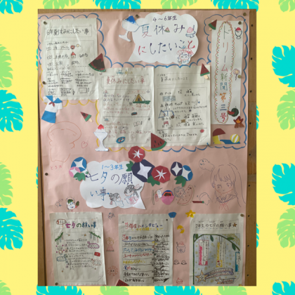 そして、新聞委員会のかべ新聞です。高学年は夏休みにしたいこと、低学年は七夕の願い事の記事です。うまくまとめられていますね。