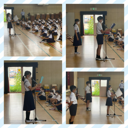 次は、1学期の思い出発表です。今日は、3年生と6年生の発表でした。3年生は、「鷹合フェスティバル」と「阿倍野ハルカスへの社会見学」、6年生は、「最後の鷹合フェスティバル」と「プールそうじ」についての思い出を発表してくれました。4人とも大きな声で立派に発表してくれ、大きな拍手が起こりました。