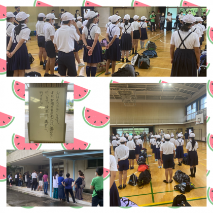 いつもは、玄関前の運動場で出発式を行うのですが、外は雨。講堂で行いました。