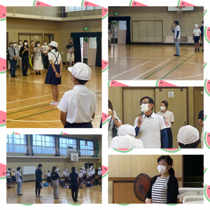 引率の教頭先生から、一緒に楽しい時間を過ごしましょうと挨拶がありました。スムーズな司会のもと、保健の白川先生、奥野先生、田中先生、そして、笠井先生、増池先生の紹介があり、みんなで、見送りの保護者の方に向かって、
