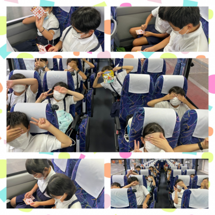無事にバスに乗り込んだ子どもたちの様子です。しおりでこれからの予定を確認したりおしゃべりに夢中だったり、酔わないように外の景色を見たり、いろいろな過ごし方をしています。