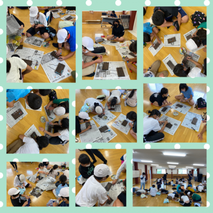 すすがついた焼いていある木の板を、ブラシと新聞紙で磨いていきます。宿舎の方から、木目にそって磨くこと、水に濡らさないことなど、うまく磨く方法を伝授してもらいます。磨きあがった焼き板は、笠井先生チエック!?が入ります。指にすすがついていると、、、