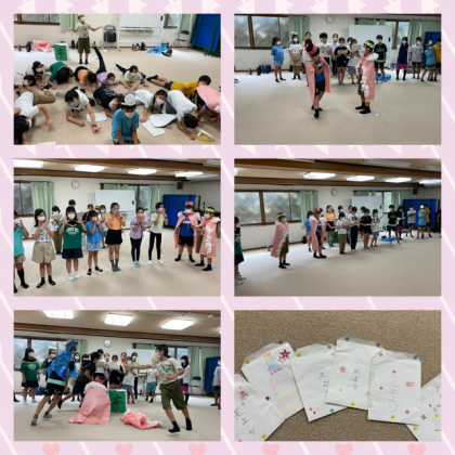焼き板の後は、キャンプのファイアーの練習です。今日は、雨のため本番は明日に持ち越し。明日の本番に向けて、スタンツの練習に向けて取り組んでいます。