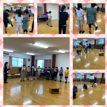 キャンプファイアー係で、明日の進行を練習しています。盛り上がるように、入念にチェックが行われています。こちらは、増池先生が担当のようです。