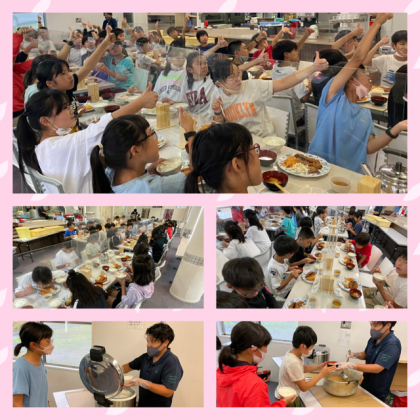 お味噌汁とごはんはおかわりOK。給食でもいつも完食する5年生は、見逃しません。おかわりのカウンターには、列ができています(笑)子どもたちだけで、ご飯4升食べ、お味噌汁20L完食。宿舎の人もビックリです!!