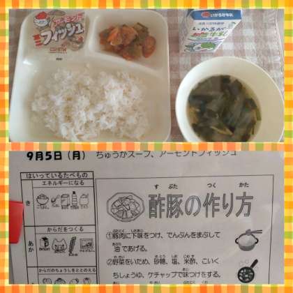 酢豚は、あげた豚肉といためた野菜を甘酢でからめていて、白ごはんと相性バツグです。わかめの入ったあっさりした中華スープと一緒に、よりおいしくいただきました。