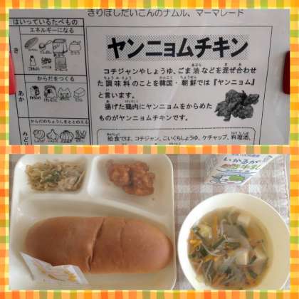 「ヤンニョムチキン」の「ヤンニョム」とは、コチジャンやしょうゆ、ごま油を合わせた調味料のことだそうです。あげた鶏肉にヤンニョムをからめているので、ヤンニョムチキンというのですね。給食では、食べやすいように、辛さは控えめでケチャップ、料理酒、みりんが入っています。