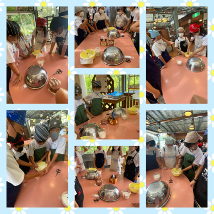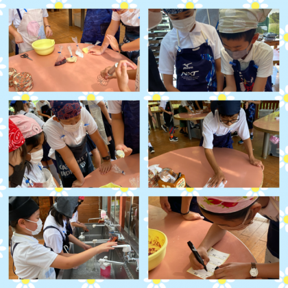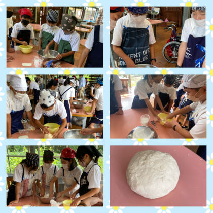 まずは、身支度を整えて、材料をまぜていきます。工程が複雑で、グループで協力しないとうまくいきません。まとめたものをこねるのですが、手にくっついて…困っている人いっぱいいました。(笑)