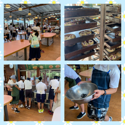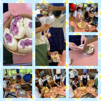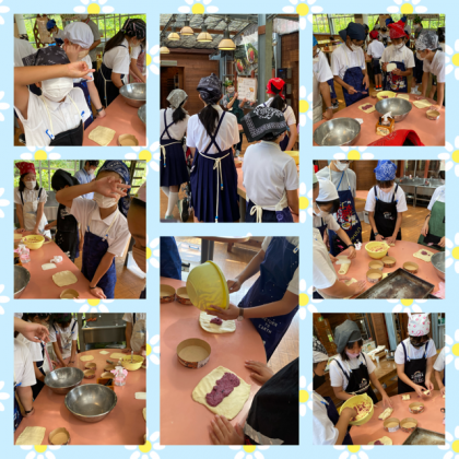 楽しい牛さんのクイズのあとは、発酵が終わったパンだねに作ったブルーベリージャムをのせて、成型し、型に入れて焼いてもらいます。