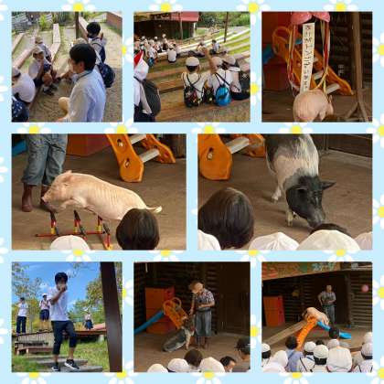 パン作りの後は、ミニブタ芸です。少し時間があるので、散策を楽しんでます。ヤモリを見つけて、津村先生に見せたあげると、