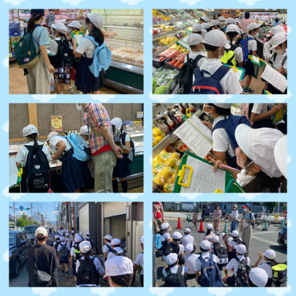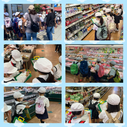 店内では、グループごとの調べ学習開始。本来なら、お店でお買い物をしているお客さんにインタビューするのも大切な学習の一つなのですが、コロナ感染対策で難しく、、、お客さんに扮した保護者ボランティアの方にお願いしています。