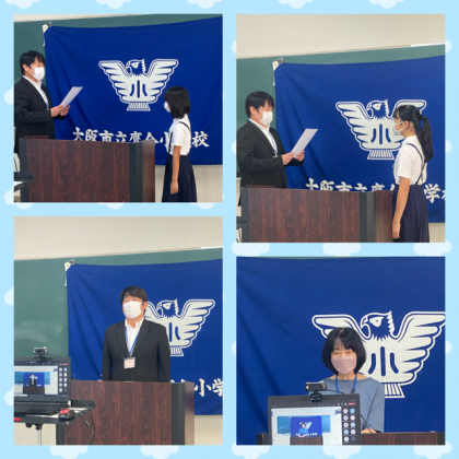 まず、児童絵画・版画展で入賞した6年生と4年生の2人の表彰が行われました。立派ですね✨