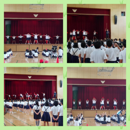 赤組が講堂に集まって、みんなで応援の動きの練習をします。本番は運動場ですが、今日は舞台の上で、応援団がかっこいい姿を見せています。